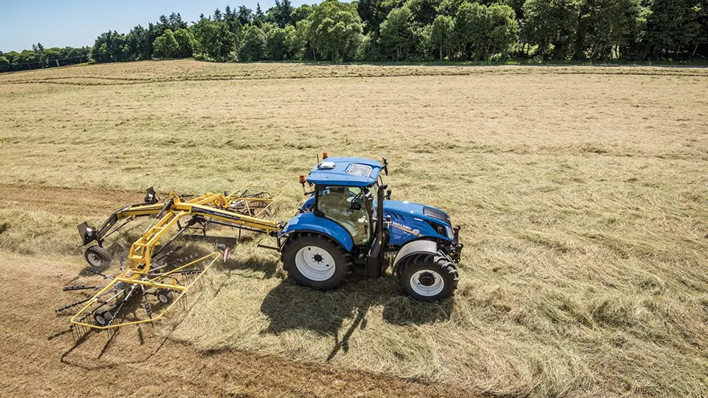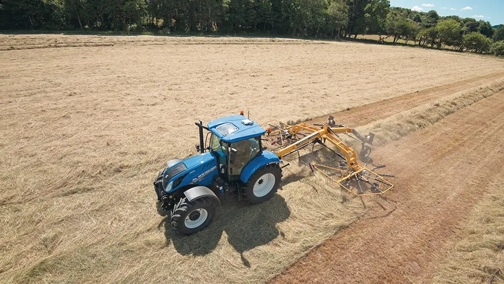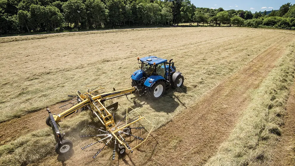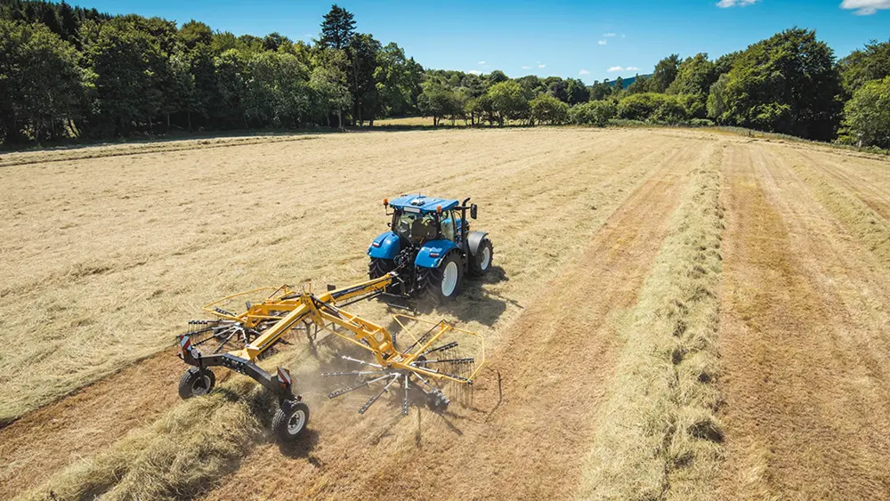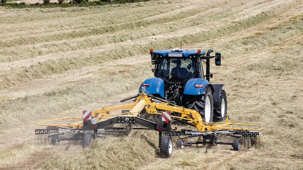 O ProRotor™ C, Enleirador de Rotor Duplo, garante o descarregamento central do cultivo. Conectado aos braços de ligação, pode ser dobrado hidraulicamente para transporte, e quando é configurado para transporte, tem menos de quatro metros de altura, ideal para transportar em áreas com folhagem abundante.